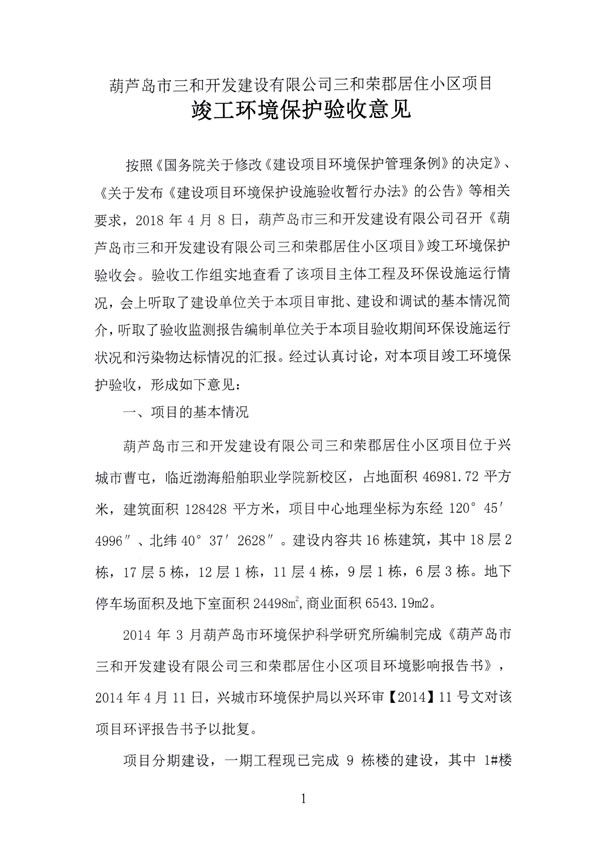 2014年3月葫蘆島市環(huán)境保護(hù)科學(xué)研究所編制完成《葫蘆島市三和開(kāi)發(fā)建設(shè)有限公司三和榮郡居住小區(qū)項(xiàng)目環(huán)境影響報(bào)告書》,2014年4月11日,興城市環(huán)境保護(hù)局以興環(huán)審 【2014】11號(hào)文對(duì)該項(xiàng)目環(huán)評(píng)報(bào)告書予以批復(fù)。