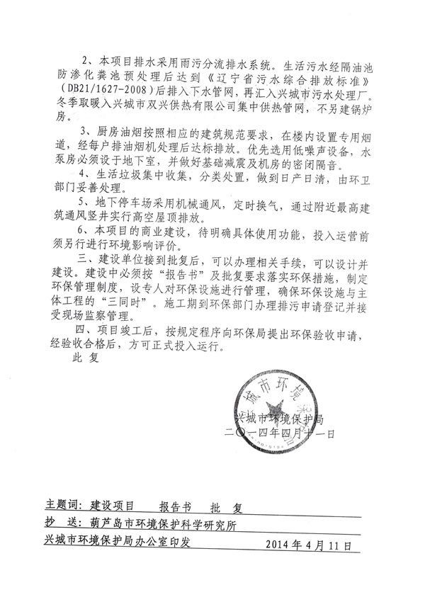 。13)興城市環(huán)境保護(hù)局 興環(huán)審【2014】11號(hào)文《關(guān)于葫蘆島市三和開(kāi)發(fā)建設(shè)有限公司三和榮郡居住小區(qū)項(xiàng)目環(huán)境影響報(bào)告表的批復(fù)》,2014年4月11日;