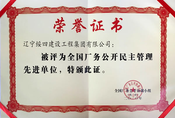 2020年8月,遼寧綏四建工集團(tuán)喜獲“全國(guó)廠務(wù)公開(kāi)民主管理先進(jìn)單位”榮譽(yù)稱(chēng)號(hào)。