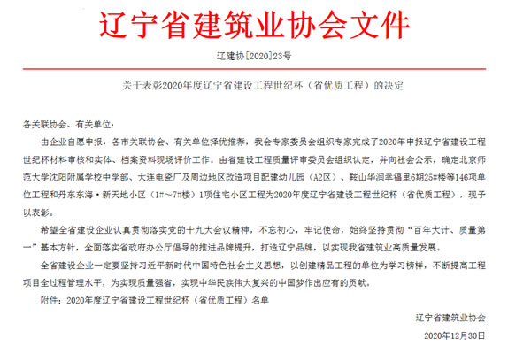 2020年12月30日,遼寧省建筑業(yè)協(xié)會發(fā)布了“關于表彰2020年度遼寧省建設工程世紀杯(省優(yōu)質(zhì)工程)和遼寧省建設工程優(yōu)質(zhì)結構的決定”。2020年,集團所有參評項目在前期各關聯(lián)協(xié)會、有關單位推薦的基礎上,經(jīng)專家組材料審核、現(xiàn)場和會議評價,遼寧省建設工程質(zhì)量評審委員會、世紀杯專家組認定,最終進行公示。集團2項工程榮獲 “2020 年度遼寧省建設工程世紀杯”,14項工程榮獲“2020年度遼寧省建設工程優(yōu)質(zhì)結構”榮譽稱號。此次榮譽的獲得是對集團堅持精細化管理、不斷提質(zhì)增效的肯定。