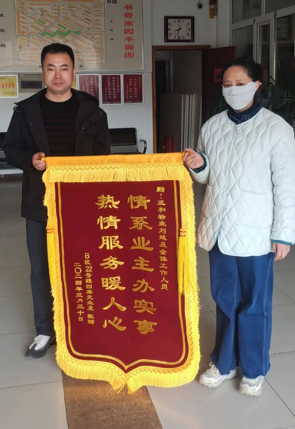 近日,書香家園B區(qū)一業(yè)主親手將一面繡有“情系業(yè)主辦實事 熱情服務暖人心”的錦旗贈送給三和物業(yè)團隊,以表達對他們在處理下水道堵塞問題上所展現(xiàn)出的高效服務和專業(yè)務實態(tài)度的高度贊揚與深深感謝。