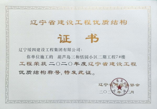“葫蘆島三和恬園小區(qū)二期工程7#樓”榮獲2020年度遼寧省建設工程優(yōu)質(zhì)結(jié)構(gòu)稱號