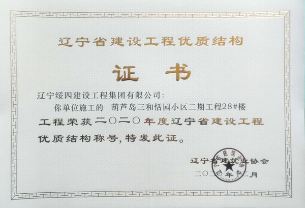 “葫蘆島三和恬園小區(qū)二期工程28#樓”榮獲2020年度遼寧省建設(shè)工程優(yōu)質(zhì)結(jié)構(gòu)稱號(hào)