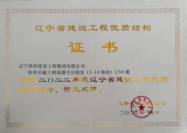 撫順今日陽光 11# 地塊) C5# 樓榮獲2022年度遼寧省建設(shè)工程優(yōu)質(zhì)結(jié)構(gòu)稱號
