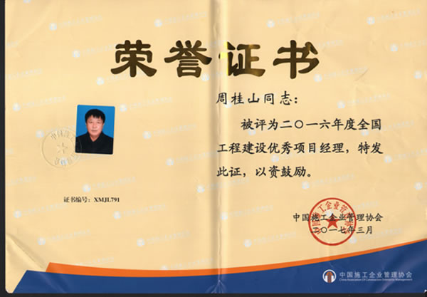 大會表彰了2016年度獲得全國優(yōu)秀施工企業(yè)稱號的單位并頒發(fā)了證書。我公司榮獲“2016年度全國優(yōu)秀施工企業(yè)”稱號,周桂山同志榮獲“全國工程建設(shè)優(yōu)秀項目經(jīng)理”稱號。