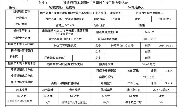 2014年3月葫蘆島市環(huán)境保護(hù)科學(xué)研究所編制完成《葫蘆島市三和開(kāi)發(fā)建設(shè)有限公司三和榮郡居住小區(qū)項(xiàng)目環(huán)境影響報(bào)告書》,2014年4月11日,興城市環(huán)境保護(hù)局以興環(huán)審 【2014】11號(hào)文對(duì)該項(xiàng)目環(huán)評(píng)報(bào)告書予以批復(fù)。