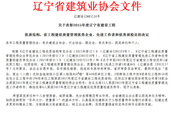 根據(jù)《遼寧省建設(shè)工程優(yōu)質(zhì)結(jié)構(gòu)審定辦法(2015年修訂)》(遼建協(xié)[2015]9號)、《遼寧省工程建設(shè)質(zhì)量管理優(yōu)秀企業(yè)審定辦法(2015年修訂)》(遼建協(xié)[2015]10號)文件精神,由企業(yè)自愿申報(bào),市擇優(yōu)推薦審核,省評審委員會審定,遼寧綏四建設(shè)工程集團(tuán)榮獲以下榮譽(yù)和獎項(xiàng): 。ㄒ唬┻|寧綏四建設(shè)工程集團(tuán)有限公司被評為2015年度遼寧省工程建設(shè)質(zhì)量管理優(yōu)秀企業(yè)。 。ǘ┘瘓F(tuán)榮獲省優(yōu)質(zhì)主體結(jié)構(gòu)獎項(xiàng)工程: 1、綏中縣全民健身活動中心; 2、葫蘆島市龍港區(qū)兩河三村回遷樓改造二期一標(biāo)段1#樓; 3、葫蘆島市龍港區(qū)兩河三村回遷樓改造二期一標(biāo)段2#樓; 4、葫蘆島三和榮郡1#住宅樓; 5、葫蘆島三和榮郡2#住宅樓; 6、葫蘆島三和榮郡3#住宅樓; 7、葫蘆島三和榮郡4#住宅樓; 8、葫蘆島三和榮郡5#住宅樓; 9、葫蘆島三和榮郡6#住宅樓; 10、葫蘆島三和榮郡7#住宅樓; 11、葫蘆島三和榮郡8#住宅樓; 我集團(tuán)將繼續(xù)認(rèn)真落實(shí)住建部關(guān)于工程質(zhì)量兩年治理行動要求,創(chuàng)建出更多更好的精品工程,樹立企業(yè)品牌,為做強(qiáng)做大遼寧省建筑業(yè)的宏偉目標(biāo)作出新的貢獻(xiàn)。