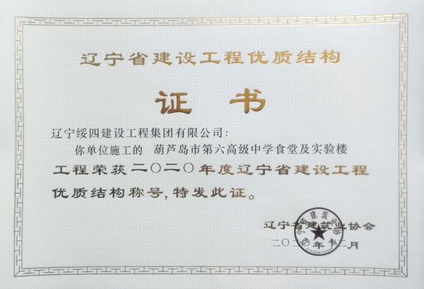 “葫蘆島市第六高級中學食堂及實驗樓”榮獲2020年度遼寧省建設工程優(yōu)質(zhì)結構稱號