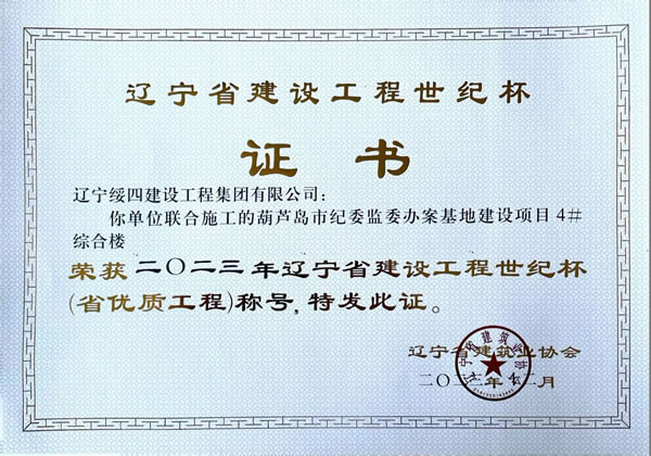 葫蘆島市紀(jì)委監(jiān)委辦案基地建設(shè)項(xiàng)目4#綜合樓 榮獲2023年遼寧省建設(shè)工程世紀(jì)杯(省優(yōu)質(zhì)工程)稱號